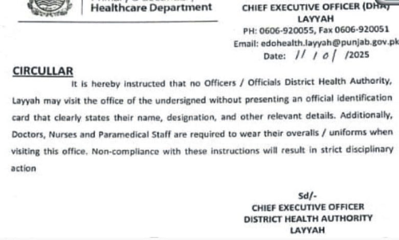 لیہ سی ای او ہیلتھ کا ڈاکٹرز، نرسز اور پیرا میڈیکل اسٹاف کے لیے یونیفارم لازمی قرار دینے کا حکم