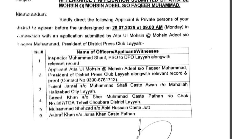 سعید احمد نامی شہری نے فیصل جمال اور محسن عدیل چوہدری کیخلاف ڈی پی او لیہ کو درخواست گزاری جس میں سنجیدہ نوعیت کے الزامات تھے ۔ محسن عدیل چوہدری نے ایڈیشنل آئی جی جنوبی پنجاب کو درخواست گزاری کہ مجھے ضلعی پولیس پر تحفظات ہیں جس پر ایڈیشنل آئی جی نے آر پی او آفس کو انکوائری کرنے کے احکامات جاری کیے ۔ آر پی او آفس کی طرف سے لیٹر نمبری 1634 کے مطابق 28جولائی 2025 کو صبح 9بجے انکوائری ہوگی ۔